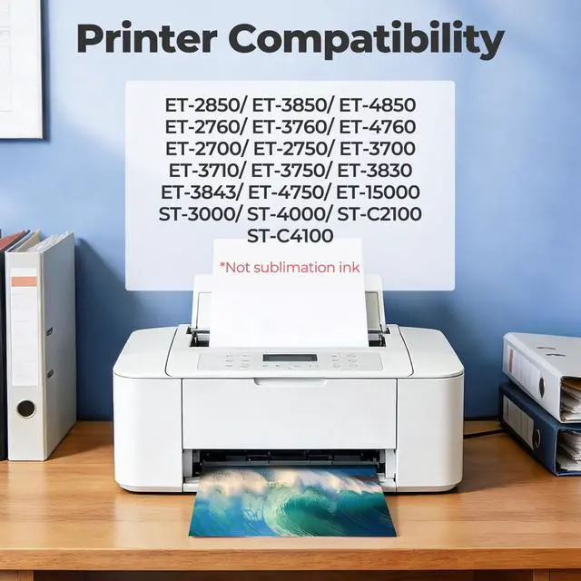 Compatible for: ET 2850, ET 3850, ET 4850, ET 4760, ET 3760, ET 2760, ET 3830, ET 3843, ET 2750, ET 4750, ET 3750, ET-2980, ET-2988, ET-3943 printers; for et-2760 ink, et-3760 ink, et-4760 ink, et-2850 ink, et-3850 ink, et-4850 ink, et-15000 ink, et-3830 ink, et-2980 ink, et-2988 ink, et-3943 ink, et-3843 ink; for 2850 ink, 3850 ink, 3843 ink, 4850 ink, 2760 ink, 3760 ink, 4760 ink; for et 3850 ink refill, et 2850 ink refill, et 4850 ink refill, et 2760 ink refill, et 3760 ink refill, et 4760 ink refill, et- 3830 ink refill, et-2850 ink refill bottles