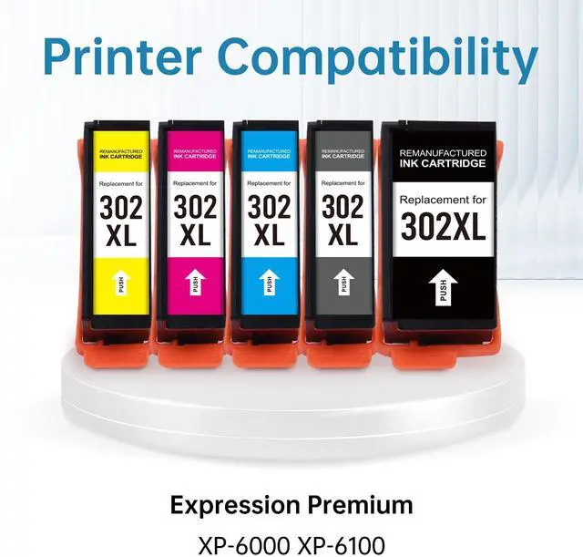 Replacement: NON-OEM Product, remanufactured ink cartridge replacements for Epson 302. Undergoes 3-Stage Quality Testing (Leakage/Compatibility/Print Quality), safe, non-toxic & durable for long-term reliable use with XP-6000/XP-6100 ^^ Updated Smart Chip for 302XL
