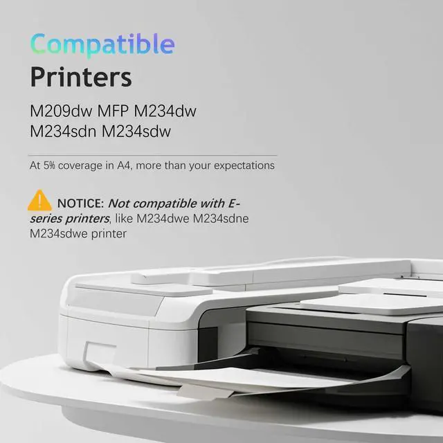 NOTICE: Not compatible with E-series printers, like M234dwe M234sdne M234sdwe printer/ Message of Cartridge Low might be popped up every time you start printing, please ignore it since we are applying transferred chip/ Cartridge might not be able to show the print pages ^^