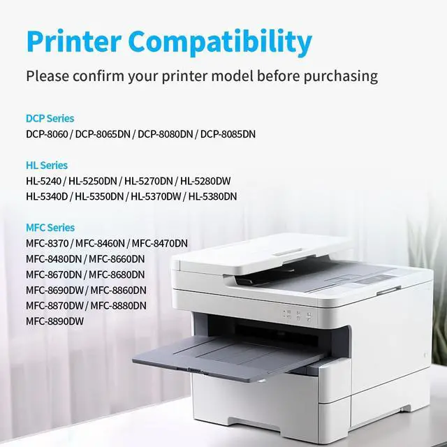 Compatible Printers: Compatible with Brother DCP-8060, DCP-8065DN, DCP-8080DN, DCP-8085DN, HL-5240, HL-5250DN, HL-5270DN, HL-5280DW, HL-5340D, HL-5350DN, HL-5370DW, HL-5380DN, MFC-8370, MFC-8460N, MFC-8470DN, MFC-8480DN, MFC-8660DN, MFC-8670DN, MFC-8680DN, MFC-8690DW, MFC-8860DN, MFC-8870DW, MFC-8880DNP, MFC-8890DW Printer ^^