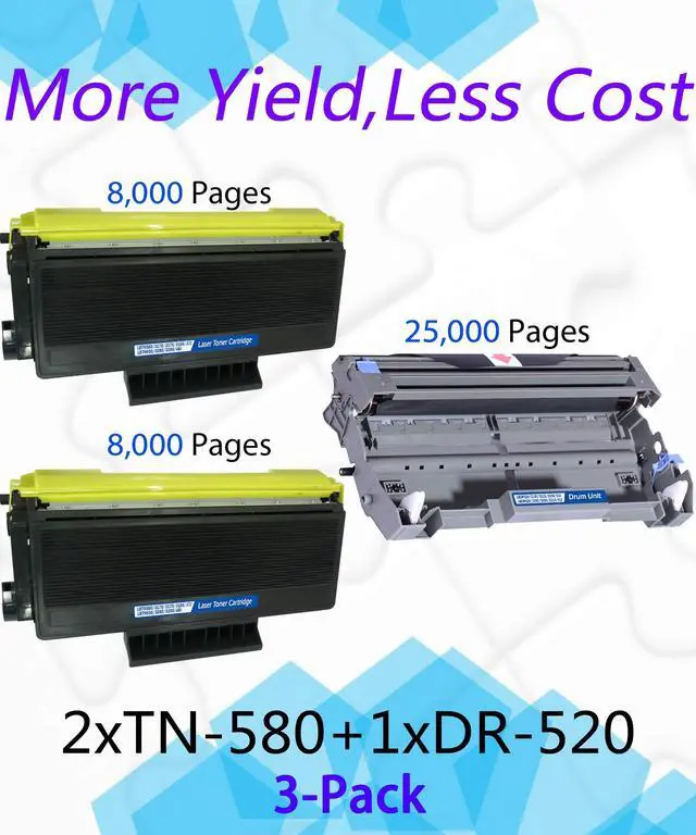 Package Contents: (3-Pack, 1Drums & 2Toner) 1-Pack DR-520 Drum Unit +2-Pack TN-580 TN650 TN620 Toner Cartridge ^^