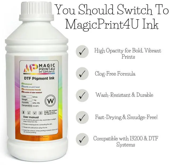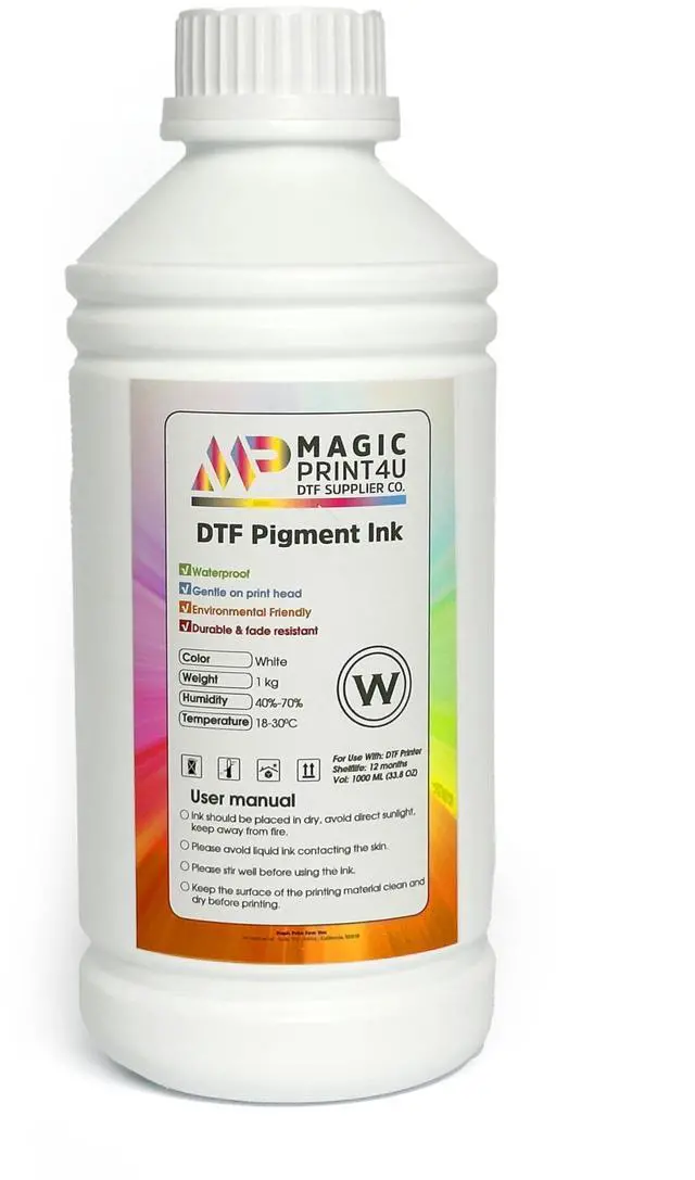 Upgrade your print quality with our MagicPrint4U DTF Pigment Ink the trusted choice for apparel decorators, DTF print shops, and creators looking for reliable performance and high-impact results. Whether you're running a commercial operation or an advanced home setup, this 1000ml white DTF ink bottle delivers crisp, vibrant, and wash-resistant prints on a wide range of garments. Our ink is specially developed for direct-to-film printing, a process that demands precise ink formulation to avoid clogs, uneven coverage, or color fading. This high-opacity white ink lays down strong underbases that make your colors pop even on dark or blended fabrics.