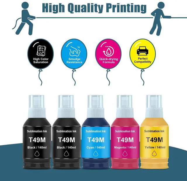 Products: 700ML T49M sublimation ink includes 2x140ml black T49M1, 1x140ml cyan T49M2, 1x140ml magenta T49M3, 1x140ml yellow T49M4.