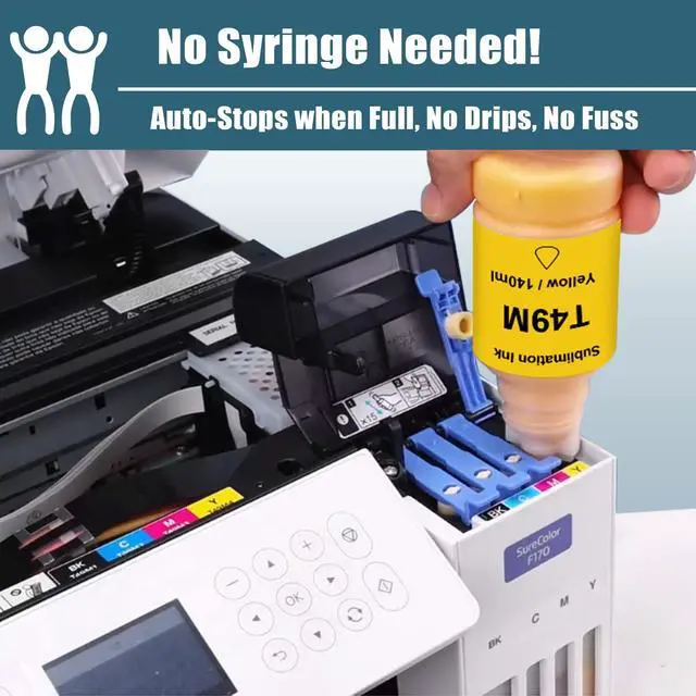 Note: Sublimation ink can only be used in fabrics containing less than 30% cotton. ^^ User friendly--Auto-fill nozzles no longer require a syringe. The bottle mouth fits perfectly with the ink inlet of the ecotank sublimation printer, which helps prevent ink spills or messes! Simply insert the bottle into the cartridge to start filling and stop automatically.