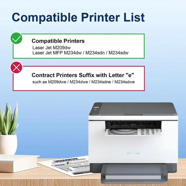 NOTE: NOT compatible for Contract Printers Suffix with Letter "e", such as Laser jet M209dwe M234dwe M234sdne M234dwe (Please confirm your printer model before purchase)