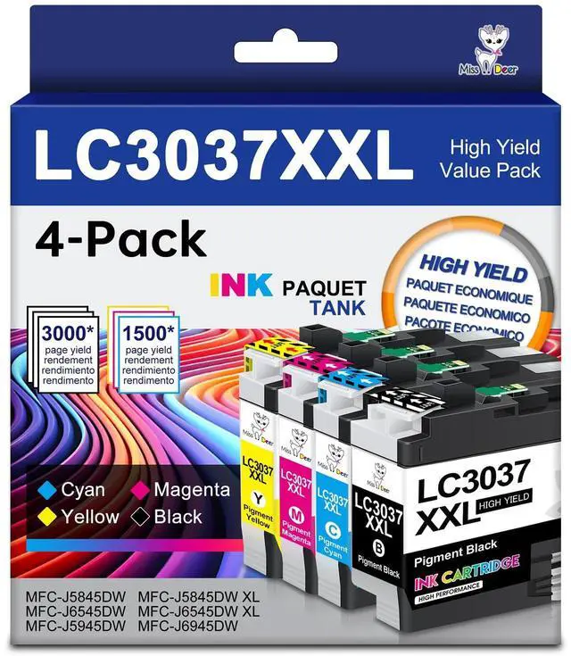 Brother lc3037 ^^: Up to 3000 pages per lc3037xxl black ink cartridge, 1500 pages per lc3037xxl color ink cartridge (at 5% coverage of Letter/A4, XXL version for extra high page yield than standard) ^^: MS DEER lc3037xxl ink cartridges suitable for Home, Office, School, Bank, and Hospital ^^ *Please confirm your printer model number and LC3037 LC3039 ink cartridges model number before placing orders