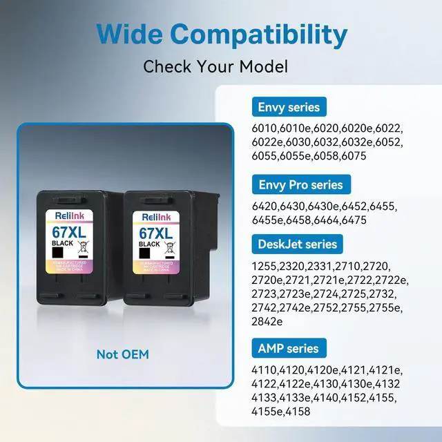 ^^ Wide Printer Compatibility: ReliInk for printer ink hp 67 is compatible with various printers, including HP DeskJet 1255 2320 2331 2333 2710 2720 2720e 2721 2721e 2722 2722e 2723 2723e 2724 2725 2732 2742 2742e 2752 2755 2755e 2842e 2855e 2821e 2823e 2827e 4100 4110 4120 4120e 4121 4121e 4122 4122e 4130 4130e 4132 4133 4133e 4140 4152 4155 4155e 4158 4255e and ENVY 6010 6010e 6020 6020e 6022 6022e 6030 6032 6032e 6052 6055 6055e 6058 6075 6420 6400 6430 6430e 6452 6455 6455e 6458 6464 6475.