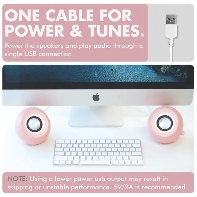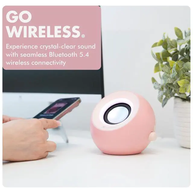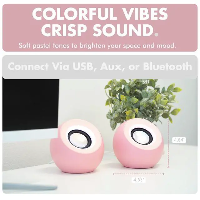 (3 WAYS TO CONNECT) Play your music with the speakers for laptop through Bluetooth, USB wired, or AUX in for maximum flexibility with any device. ^^ (CUSTOMIZABLE LED LIGHTING) Cycle through 10 vibrant LED color options on our pink pc speakers or turn them off for a clean and calm workspace. ^^ (COLOR YOUR SPACE WITH SOUND) Our small speakers for computer desktop are equipped with dual 2.25 inch drivers with passive radiators that fill your space with rich, lively audio for every mood and moment. ^^ (SIMPLE CONTROLS AT YOUR FINGERTIPS) Quickly adjust volume, change LED colors, and switch between Bluetooth 5.4, USB, or AUX with simple button controls on our pink speakers for pc.
