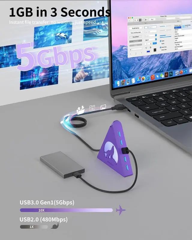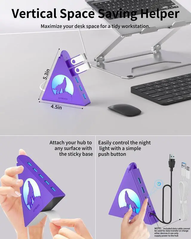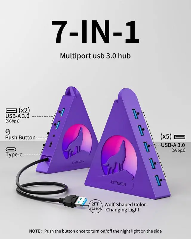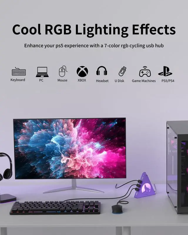 external hard drives (note: not for charging). With data transfer speeds of up to 5Gbps, its over 10 times faster than USB 2.0, making file transfers and backups quick and efficient. Featuring vibrant RGB lighting and a unique triangular design, this hub adds a stylish touch to your workspace. The wolf-head LED cycles through seven colors, while double-sided adhesive tape ensures secure mounting to your desk. The 2FT extension cable provides flexible placement options, and the included cable tie helps keep everything organized. Compatible with Windows, Mac OS, and Linux, it works seamlessly with laptops, desktops, Xbox, PS4/PS5, flash drives, printers, and more. Ideal for expanding connectivity and keeping your workspace tidy.