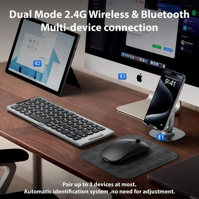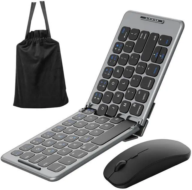 Pocket-Size Foldable Keyboard and Mouse Miieadoo foldable keyboard compact ( 10.6 x 3.9" unfolded) with sturdy metal hinge. Quiet scissor keys for smooth typing on tablets, iPad Mini, or laptops. Works with iOS/Android/Windows/Mac, connects to 3 devices at once ^^ Complete Travel Keyboard & Mouse Set Includes portable keyboard and mouse, silent mouse, anti-slip pad, and storage bag. The ultimate all-in-one solution for mobile productivitywork effortlessly anywhere, whether on a plane, in a cafe, or while traveling for business. ^^ Sleek & Durable Foldable Keyboard Crafted with premium matte dark gray ABS+PC material, this compact folding keyboard resists fingerprints, slips, and scratches.