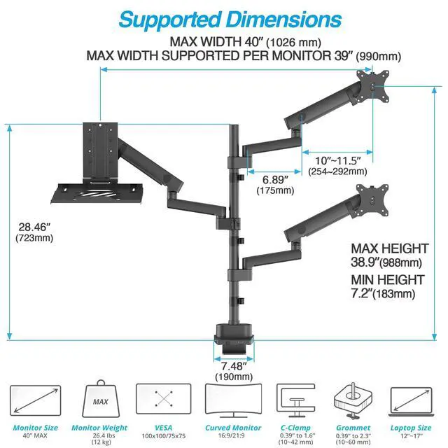 ^^ Space-Saving Desk Mount: Compact C-clamp takes only 5.7" x 4.3" (145mm x 108mm) of desk space, fits desks up to 1.9" (50mm) thick, maximizes work area without sacrificing stability. ^^