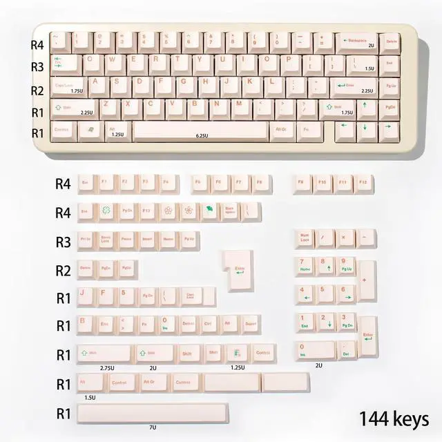 What You Get: This is a set of 144 keys beige keycaps. The keycap have clear characters and warm colors to provide a comfortable vision. Please note that only the keycaps are provided, and the keyboard is not included ^^ Cherry Profile KeycapsThese keycap feature the cherry profile design for a more ergonomic fit. The high keycaps and curved layout provide a lasting comfortable experience, even with prolonged use, preventing fatigue. They come in a standard beige color ^^ ANSI/ISO KeycapsThis PBT keycap set includes a total of 144 keys, including 6.25 u and 7u spacebar. It is suitable for keyboards in sizes 61, 64, 68, 84, 75, 87, 96, 98, 104, and 108. These PBT keycaps are also compatible with keyboards using ANSI US Layout and ISO layout ^^ Dye-Sublimation PBT Keycaps Thin and thick keycaps give users a sense of texture. Keycaps made with advanced sublimation technology provide more vivid colour patterns. They are resistant to oil and dirt and have a long service life ^^ Good Service Provided1x144 cherry profile pbt key caps with a keycap puller, keyboard is not included.