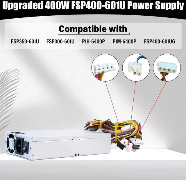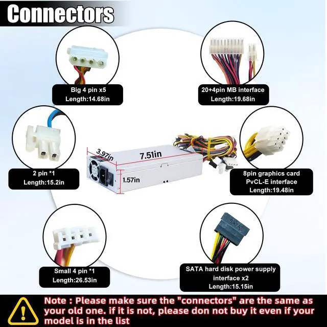(Note: Please make sure the picture is the same as what you want. If it is not, please do not buy it, even if your computer model is in the list described) ^^ What you Get1X FSP400-601U 400W Power Supply. Every FSP400-601U power supply has passed strict quality inspection before leaving the factory ^^ Note ConnectorsTotally 11 connectors. (1) 24(20+4)pin MB interface x1, (2) 8pin graphics card PCL-E interface x1, (3) SATA hard disk power supply interface x2, (4) big 4 pin x5, (5) 2 pin *1, (6) small 4 pin *1Due to the use of a white background without any reference objects during the photo shoot, the length of the lines in the image is only for reference.