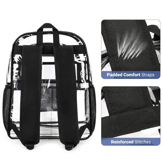 Comfort Padded Straps: Zorfin heavy duty clear backpack is equipped with ruggedly reinforced shoulder straps for added strength when carrying heavier loads. The wider, padded, and adjustable straps provide comfort and ease stress. Equipped with two-way smooth zippers and reinforced stitches, this transparent backpack is crafted for durability and everyday reliability ^^