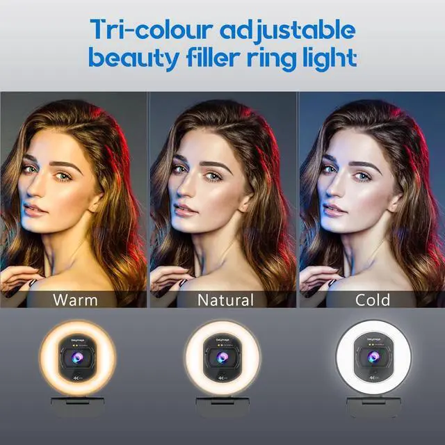 4K UHD WebcamThis webcam for pc supports resolutions from 4K@30FPS to 1080P@60FPS, with frame rates that capture every detail for a clear and smooth video conferencing experience. This web cam is perfect for conference calls, online classes or live streaming. ^^ Three Colours Infinitely DimmableThe built-in ring fill light has 3 color temperature settings (white /natural /warm ), and the color temperature can be adjusted by touching the sensor area on the back of the camera with your fingertips. Adapt to different environments, always present the best skin color. The streaming camera's innovative outer ring rotary adjustment brightness light intensity control, even in low light conditions can also get the best fill light effect.