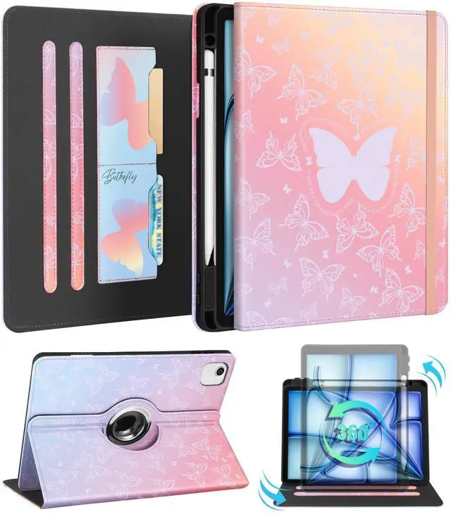 Kidcube for iPad Air 11 Inch Case M3/M2, Air 5th/4th Generation Cases 10.9'', Pro 11'' 2020 - Women Girls Aesthetic Cute Rotating Stand Folio Cover with Pencil Holder & Card Slot Kawaii Butterfly