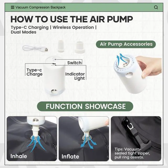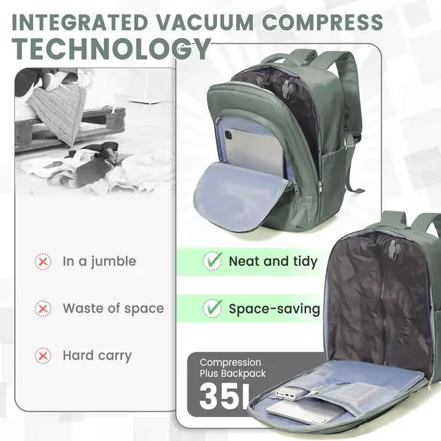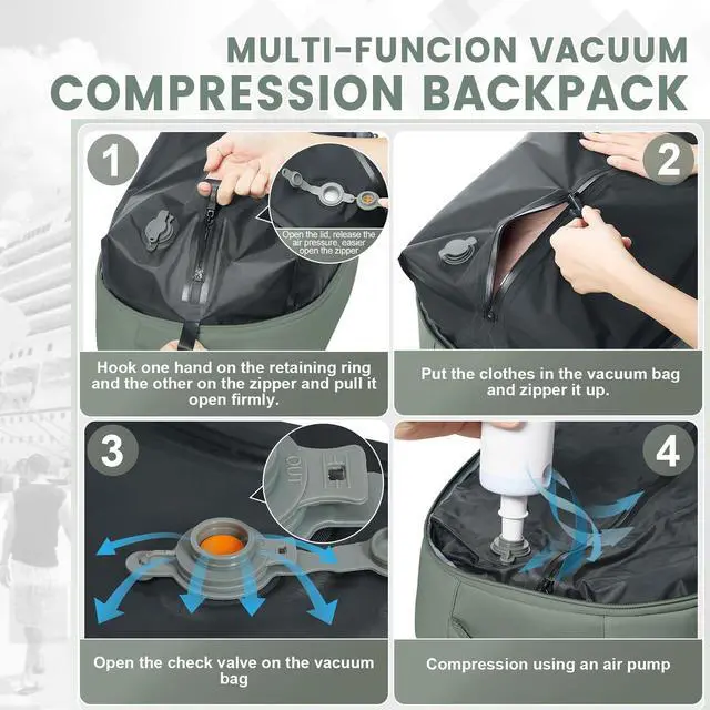 Advanced Vacuum Compression - Our system features upgraded one-way suction valves that enable ultra-efficient air removal, either with an electric pump or manual compression. Maximize your packing capacity while minimizing wasted space like never before. ^^ Included Portable Vacuum Pump - Each backpack comes with a compact, easy-to-carry vacuum pump and multiple adapter accessories. Whether you need to compress items quickly or readjust your packing space, we provide the ultimate convenience on the go. ^^ Perfectly Sized Vacuum Backpack - Measuring approximately 40*20*25CM, this backpack is designed to organize suitcase-level items with easemaking every journey more streamlined and worry-free.