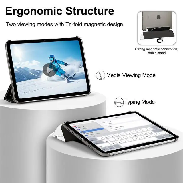 • Magnetic protective cover automatically wakes iPad when open and hibernates when closed to conserve power. Tri-fold stand provides the perfect viewing and typing angle