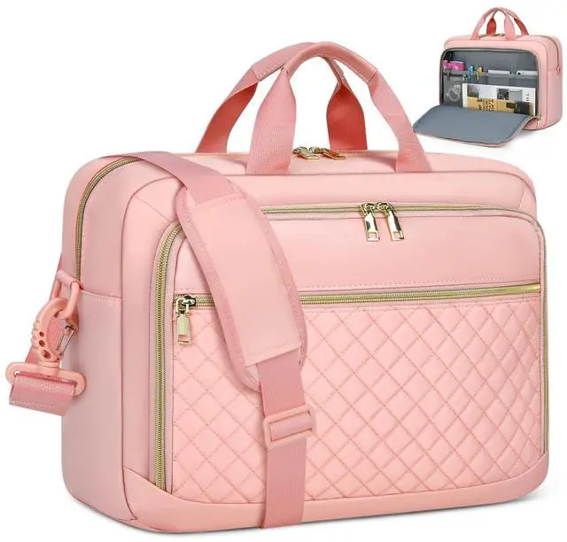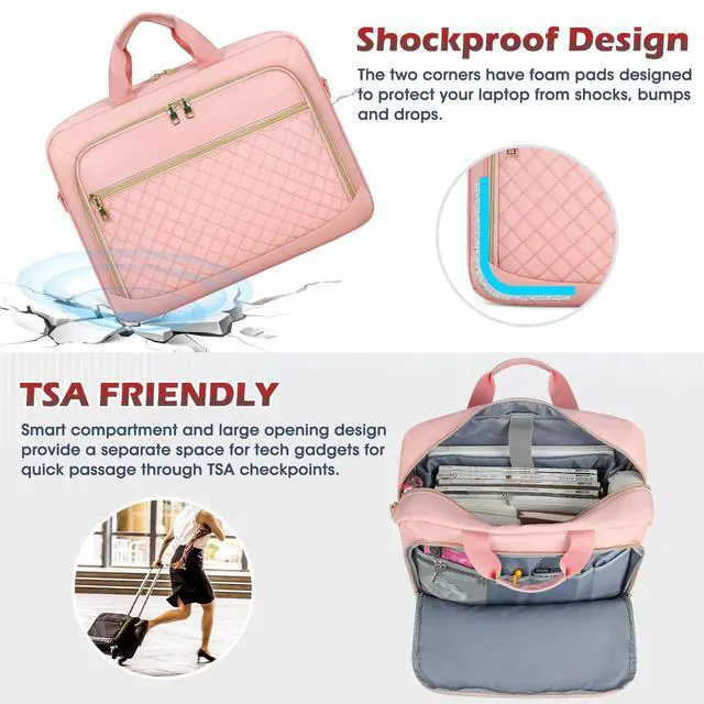 Net weight: 1.54LB, compatible with tablets and most laptops up to 17.3 inch such as Macbook Air/Pro, Chromebook, Asus, Dell, Acer, HP, Lenovo and so on. The main tech compartment of the laptop bag is filled with dedicated thick padding, providing 360-degree protection for your electronics from collisions, drops, scratches, dust, etc. ^^ Large Capacity & Multiple Pockets3-compartment design makes this computer bag meet all your needs. Main compartment features padded laptop sleeve that holds 17.3" laptop and 12.9" iPad, 2 mesh pockets for power cord and mouse, and 2 elastic mesh pockets for water bottle or umbrella. Front organizer compartment with key ring, 2 pen slots, 1 mesh zipper pocket and 2 internal slip pockets. Large front pocket for magazines, textbooks, paper, kindle, passport, wallet, etc. ^^ Convenience & Comfortable DesignTSA friendly, separate tech compartment and large opening design allow you to quickly pass through the security check. The laptop bag for women features removable, adjustable padded shoulder strap that can adjust the length to fit different heights and reduce shoulder pressure.