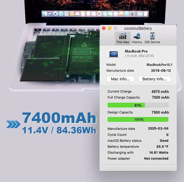 Proportion: >98%. Upgrade chip -- Up to 1500+ recharge cycles over the life of the battery, Long operating time after charging full with 7400mAh real high capacity, same with original battery A1953 ^^ Premium Electric CoreJapan Newest 4.0 upgraded OEM Battery for macbook pro 15 Inch A1990. Better circuit board, multiple command chip control, keep the battery stable charge and discharge. Over charger and discharger (short-circuit) protection, ensure fast charges and low power consumption ^^ Compatibility MacBook pro 15 inch