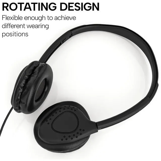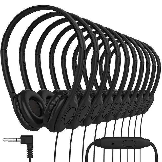 Wholesale Bundle Pack of 50 Bulk Headphones, with each headset individually packaged. Includes 10 Colors; Black Our design is kid-friendly and great for all ages. Suitable for airplane travel, school classrooms, library, museums, learning and standardized testing experiences for all ages. ^^ Maeline on-ear Headphones are designed for long-term comfort. Fit perfectly on your ears and provide a comfortable listening experience you can use all day. The soft leather ear cushions prevent sound leakage, reduce noise and improve the fidelity of music. ^^ Retractable and adjustable headband ensures optimal fitting.