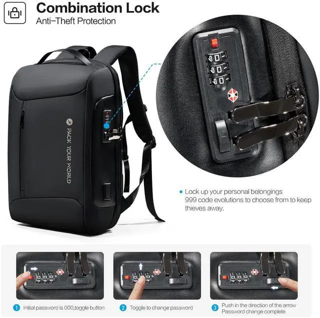 Anti Theft Backpack - This business backpack for men is designed with security in mind. It features a high-strength zinc alloy smart lock with a compact and durable body, offering superior protection against theft. The lock is scratch-resistant and easy to set (detailed instructions provided in the product listing), ensuring that your valuables are safe and secure ^^ Breathable & Comfortable - The back panel and shoulder straps are crafted with breathable sponge mesh to keep you cool and comfortable during use. Adjustable shoulder straps provide a custom fit and enhance back support, keeping the business backpack for men snugly in place.