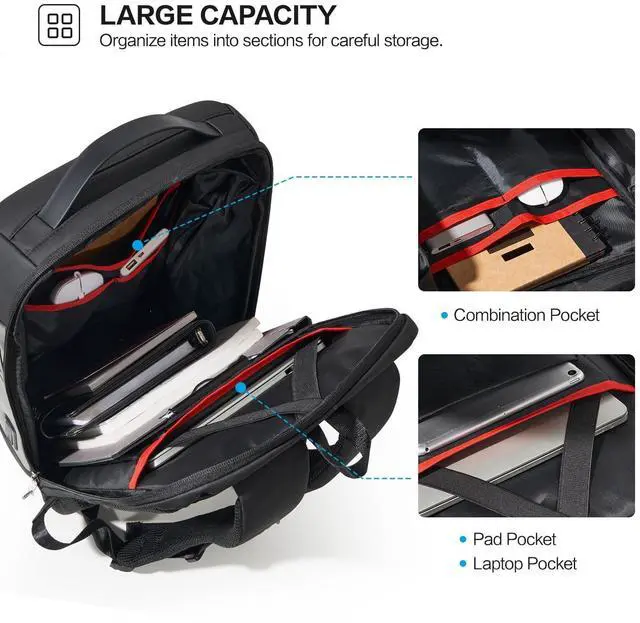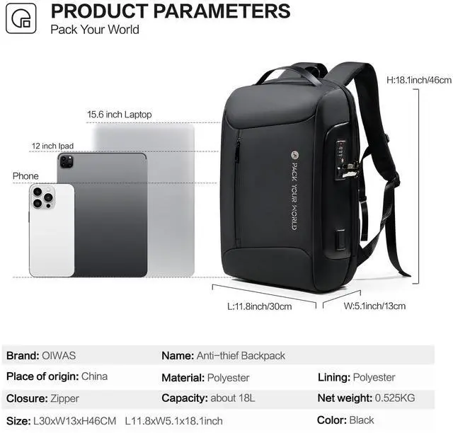 Weight: 1.15 lbs. This compartment can hold a 15.6 inch laptop and an 12 inch iPad. It is separated from the main compartment, making it easy to access and store your devices. The compartment is shockproof and water-resistant, providing excellent protection for your laptop ^^ Anti Theft Backpack with USB Charging - Business backpack for men equipped with an external USB charging port, this backpack allows you to charge your phone while on the go, making it a practical and stylish choice for busy professionals. Business backpack for men ideal for office use, business trips, weekend getaways, and more, it's the perfect gift for modern commuters ^^ Multi-purpose Anti Theft Backpack - Business backpack for men made from premium water-resistant fabric, this business backpack for men also features waterproof zippers, offering enhanced protection for your belongings in wet conditions. Whether you're commuting or traveling, rest assured your items stay dry and safe