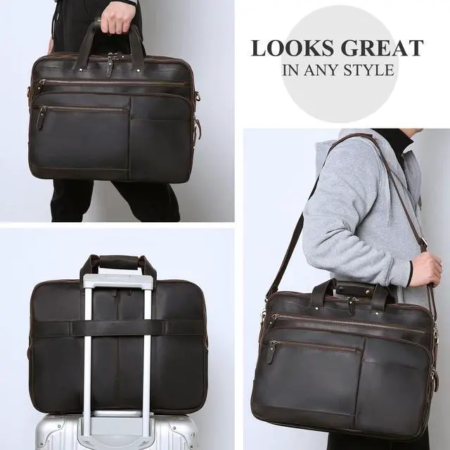 High QualityThe laptop briefcase is made of 100% full grain leather which have disorder "scratches" that present the style of retro and wildness, thick and durable. This leather satchel will be luxurious in genuine leather with a durable top handle and sturdy gold hardware. This leather laptop bag with solid and sturdy hardware for zippers, buckles, closures to ensure long lasting durability. The leather briefcase will be getting even better over time. ^^ Convenient DesignedLuggage strap on the back designed allows you attached it to a luggage securely. The leather laptop bag can be carried as top handle handbag, 17.3 laptop briefcase, business work office bag, travel crossbody messenger bag, daily shoulder bag, crossbody bag, computer bag, teacher or lawyer attache case, college students satchel.