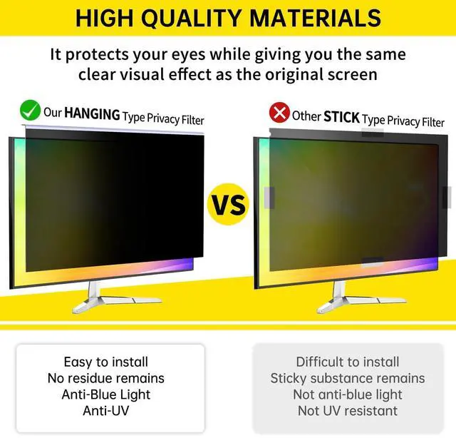 HANGING Innovation Technology This 27 inch computer privacy screen filter with hanging design avoids complex installation steps. No need to paste adhesive strips for installation and you can easily remove it at any time without worrying about leaving traces of adhesive on the computer monitor. Also, the computer screen privacy shield is durable and reusable due to the high-quality acrylic material. ^^ Privacy Filter Dimensions The privacy screen for computer monitor fits for 26", 27" widescreen monitors with a 16:9 aspect ratio.