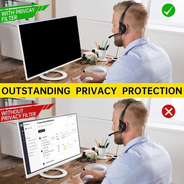Width: 24.1 '' ( 612.6 mm), Height: 14'' (356 mm), Diagonal: 27" ( 685.8 mm). Please verify your computer screen's width and height measurements before ordering. It's not recommended to make your selection based solely on your computer screen's diagonal size. ^^ Enhance Privacy Security After hanging the anti-blue light computer privacy screen filter, the screen has a visible area of 60 on the front, which makes the front of the screen clear. From both sides of the computer (30-60 angle), it will appear very dark and the screen content cannot be seen. Someone who tries to peek over the side will only see a dark screen! It greatly reduces the risk of prying eyes on personal privacy, stealing or malicious access to your important information! ^^ Eyes Protector Our 27 inch computer screen privacy shield uses a unique upgraded version of Nano 75 material, which can filter out 98% of harmful blue light (400nm-480nm) for you, maximizing the protection of your eyes. ^^ Perfect for Open Workspaces This computer privacy screen is perfect for public and high traffic areas. our monitor privacy screen is engineered to be compatible with HP, Dell, Samsung, Lenovo, LG, Acer, ASUS, ViewSonic and other monitor brands.