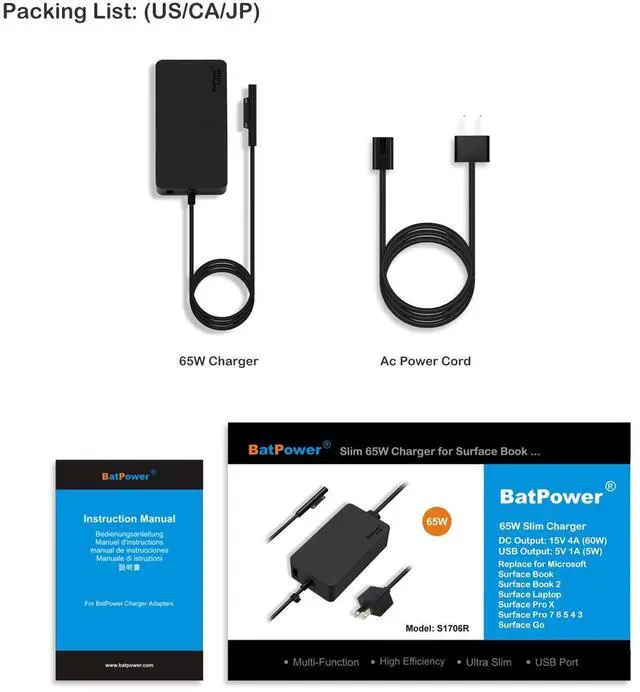 Surface series: Surface Book, Surface Laptop 1/2/3/4, Surface Pro X/4/5/6/7, and Surface Go. Perfectly matches the power needs of your Surface devices, replacing original chargers for home, office, or travel use. ^^ 65W 15V 4A Stable