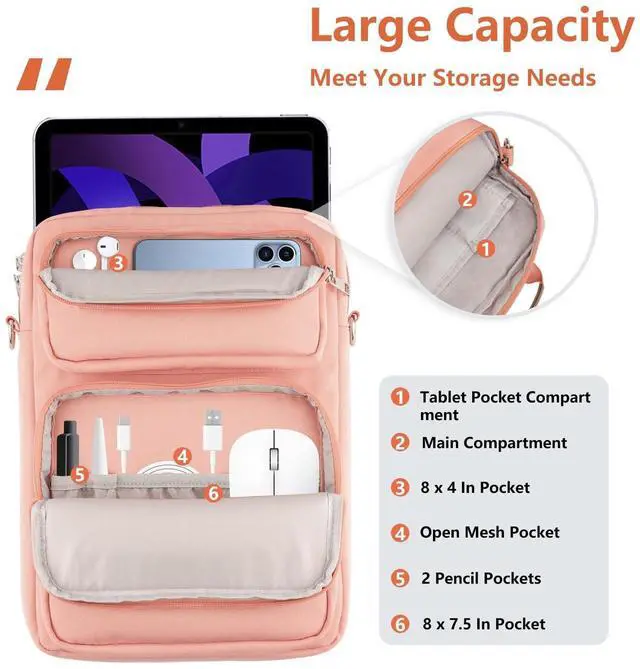 And equipped with an adjustable metal shoulder strap (longest 56 in, shortest 30 in) making it easier for you to carry. The simple and stylish design is perfect for everyday travel. ^^ Large Capacity Space - This bag for ipad has 3 pockets: 1 main compartment for your tablet, equipped with 2 compartments inside using crystal super soft fabric to protect your devices, capable of holding 2 tablets simultaneously; 2 front zippered pockets for organized storage of your hard drives, phone, data cables, chargers, power banks, headphones, cards, etc. It also comes with 2 dedicated pen pockets for Apple Pencil storage. ^^ Dimensions - External Size 13.59. 53.5 inches / 34.5249 cm, main compartment internal dimensions 139.32. 2 inches / 33235.5 cm (fits A4 paper); Front pocket 1 internal dimensions 83.71 in, Front pocket 2 internal dimensions 87.21 in. Perfect for wearing cross-body every day or putting it in other suitcase.