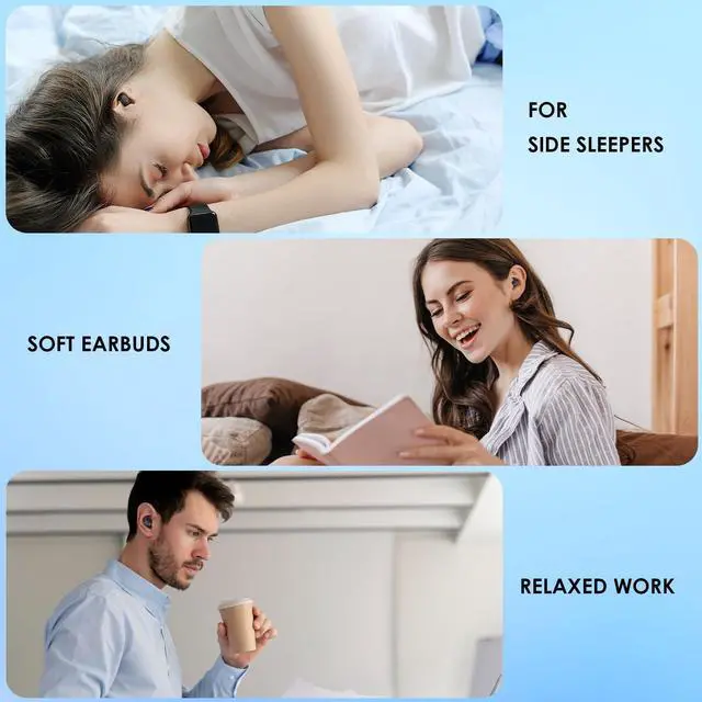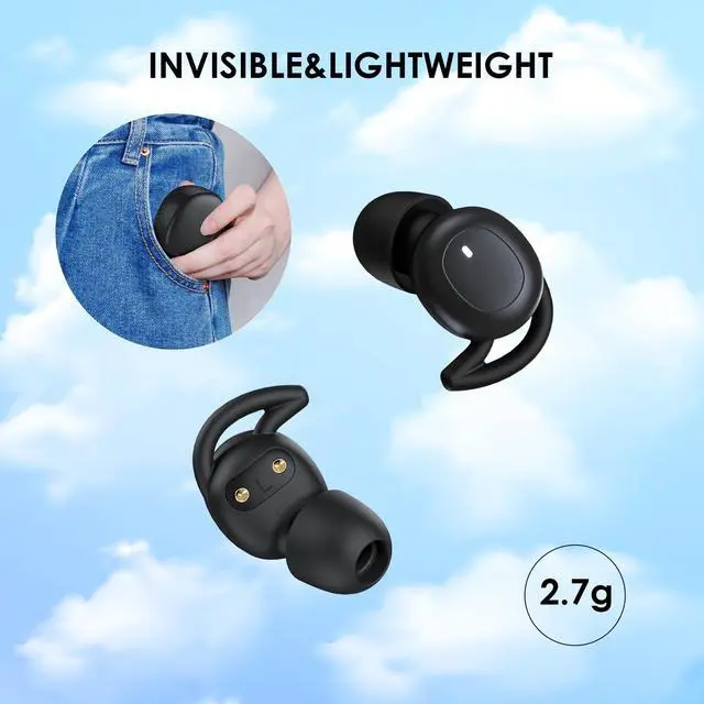 Designed for Sleep - Wireless In Ear Headphones Match 3-sizes L/M/S Earbuds tips and Earbuds Caps. Find the ideal combination for your ears, ensuring you get the most comfortable fit. not only comfort, but also a stable fit, preventing the earplugs from falling out or slipping off during the night. ^^ Lightweight&Easy to use - The small bluetooth earbuds only 2.7 g, Tiny Bluetooth Earbud makes it easy to go truly wireless. With a built-in microphone, you can answer or reject calls, play/pause music and more with just one press.