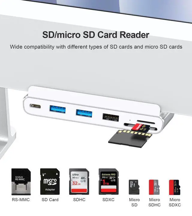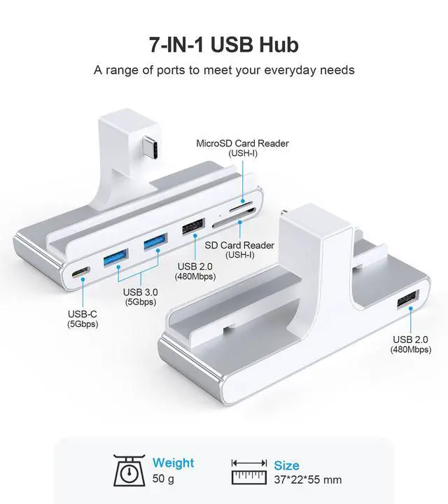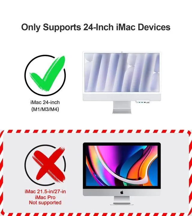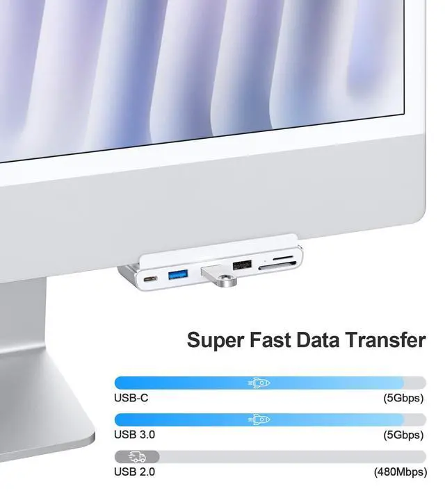 7-IN-1 USB HUB - USB C hub has 2 USB 3.0 ports, 2 USB 2.0 ports, a Type-c port, SD/micro SD card reader, multiple interfaces to meet your daily use and improve the efficiency of your work. ^^ 5Gbps RATE - USB 3.0 port and Type-c port transfer speed up to 5Gbps, able to transfer files quickly. USB 2.0 port transfer speed up to 480Mbps, easy to connect peripheral devices and peripheral storage device use. ^^ EXCLUSIVE TO IMAC - This USB C hub is designed specifically for the 2021 iMac 24-inch (M1) and 2023 iMac 24-inch (M3), NO OTHER MODELS CAN USE THIS USB C HUB.
