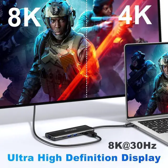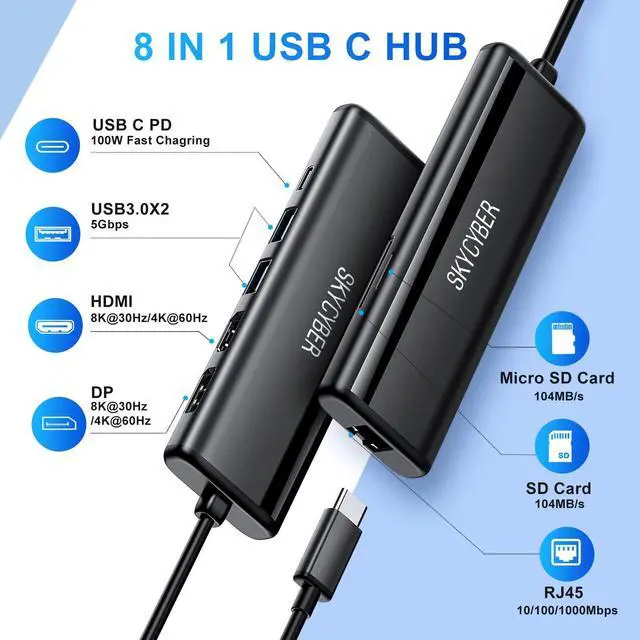 C port to 8 ports: 4K HDMI port, 8K DP display port, Gigabit Ethernet port, USB C PD port, SD and TF card reader, 2 * USB 3.0 ports. Docking station can meet your main needs and make your work more efficient. USB C hub with all extensions from a single USB-C port, suitable for all Type-C laptops. ^^ Single 8K or Dual 4K MonitorsThis USB-C docking station has 2