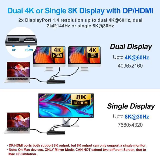 HD video output ports: HDMI + DP(both HDMI/DP interfaces support 8K@30Hz/4K@120Hz transmission). Using Universal Dock HDMI or DP can support media display up to 8K@30Hz or 4K@120HZ for a single monitor or up to 4K@60Hz for dual monitors under DP 1.4 source. Stream Ultra HD or Full HD video with 3D effects from laptop screen to a monitor, projector or HDTV. On your monitor stream movies, presentations videos or games. ^^ PD 100W Fast Charging & USB 3.0 Fast Data TransferThe USB c multiport adapter is equipped with a PD 3.0 charging port for connection support to charge your laptop (up to 85W). No need to worry about losing power to your laptop when the USB C dock is fully loaded. In addition, it is also equipped with 2 USB 3.0 ports, supporting a transfer rate of up to 5Gbps, which can transfer high-definition movies in a few seconds and can also connect a keyboard, mouse or other devices. ^^ Gigabit Ethernet & SD/Micro SD Card ReaderUSB C Hub with a support 10Mbps/100Mbps/1000Mbps RJ45 Ethernet port, just plug in an Ethernet cable and enjoy the ultra-fast Gigabit Ethernet speed and the reliability of a wired network Direct connection.