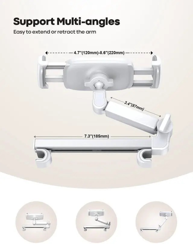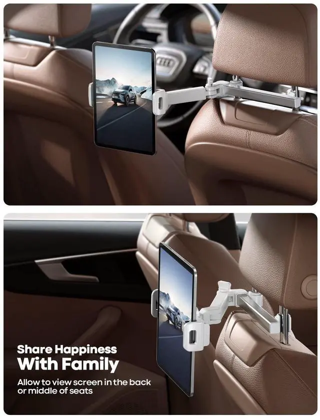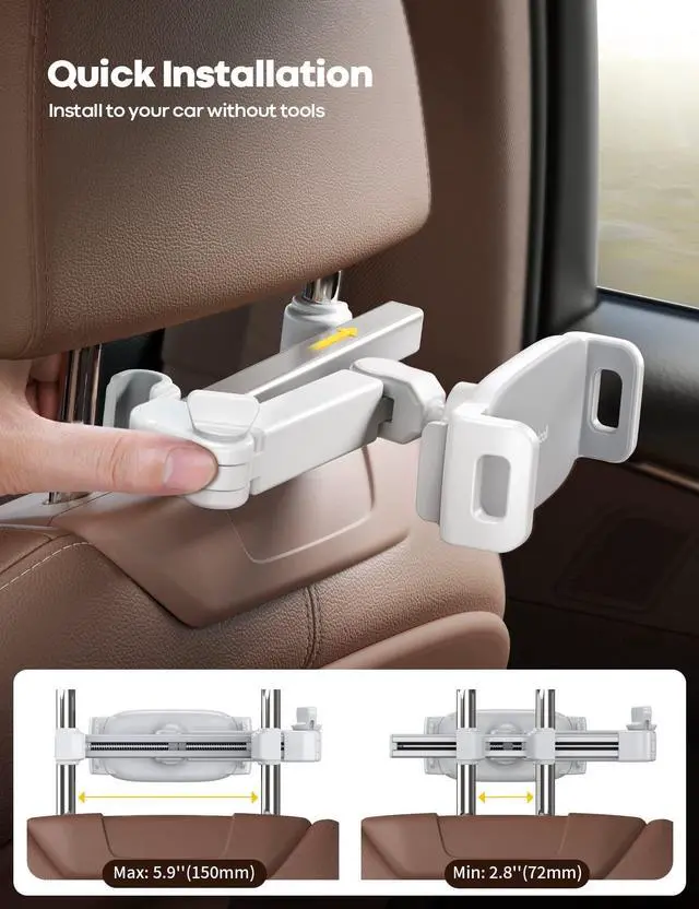 Unique Biaxial Extension Arm Twist the extendable arm in different angles allowing you to change the view distance, great for enjoying entertainment with family and friends; The articulating arm is easy to pull out or retract as needed, kids can also operate easily ^^ Metal Crossbar for Headrest Out of a considerate thought, the hook's depth on both ends of the tablet car mount is deeper, the headrest mount which is made of high-quality metal also helps greatly increase the stability during driving; The anti-slip rubber pads protect the tablet from scratching and slipping, keep your device safe ^^ Easy Installation & 360 Rotation Normally it only takes 5s to complete the installation, no tools are needed; The 360 degree rotating ball allows you to find the best view angle so kids don't have to look down the whole time, avoid neck pain, making it a great car accessory for kids ^^ Devices CompatibilityThe universal headrest tablet mount is suitable for 4.7 - 11" devices, such as 2024/ 2022/ 2021 iPad Pro 11, 2022 iPad 10.9 / iPad 10th Generation, iPad Air 6, iPad Pro 10.5 / 9.7, iPad Mini, Galaxy Tab, Kindle, Fire HD, iPhone 17 Pro Max, iPhone Air, 16, 15, 14, 13, 12, 11, Galaxy S25 Ultra, other smartphones and tablets; The max thickness the clip can fit is 0.67" (17mm), 4.7 - 11" refers to the diagonal length of the tablet screen, the suitable width of screen is 5.5 - 8.6" ^^ Wider Headrest Compatible This new version can fit headrest with narrower rod distance, the adapted distance range of headrest rods is 2.8" ( 72 mm) - 5.9" ( 150 mm), which can fits SUV, Pickup truck, Sedan and more;