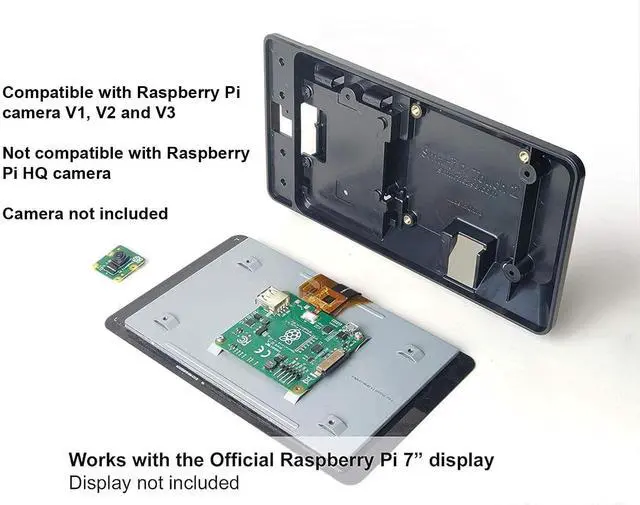 Includes a cooling fan ^^ Works with Official 7" Raspberry Pi display and Raspberry Pi 3, 4 or 5 ^^ Works with Raspberry Pi HAT boards ^^ Three faceplate options included ^^ Mounting point for Raspberry Pi official camera V1, V2 or V3. Not compatible with HQ camera. ^^ Not compatible with Raspberry Pi Touch Display 2