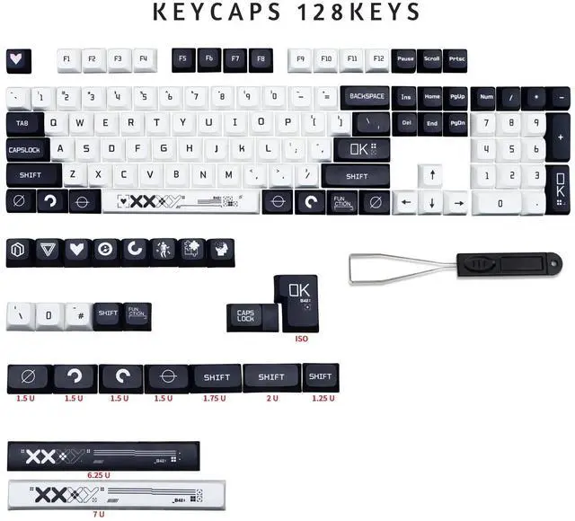NOTICE: There comes 128pcs keyboard keycaps with a keycap puller and its compatible for spacebar is 2u 2.25 u 2.75 u 3u 6.25 u, suitable for 108/104/87/84/68/64/61 Keys ASNI and ISO layout keyboard.