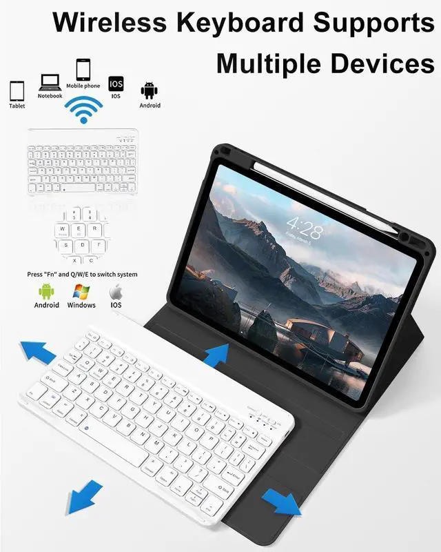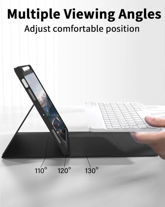 (Note: pencil is not included) ^^ Multiple Viewing Angle and Auto Sleep WakeThis Keyboard Case adopts magnetic adsorption and can be firmly fixed on the case, so it can provide a variety of stand angles for adjustment at any time. Move iPad forward or backward along the case to choose the angle that works best for your comfort. Built-in magnetic strip, support smart automatically wakes or sleep function, easily wake or close your iPad at any times, it can better save tablet power and extend its service life ^^ Package Content and