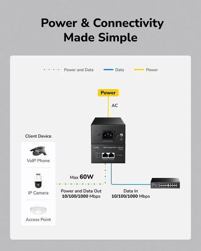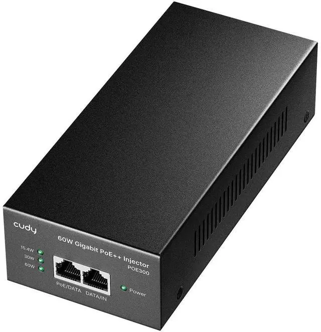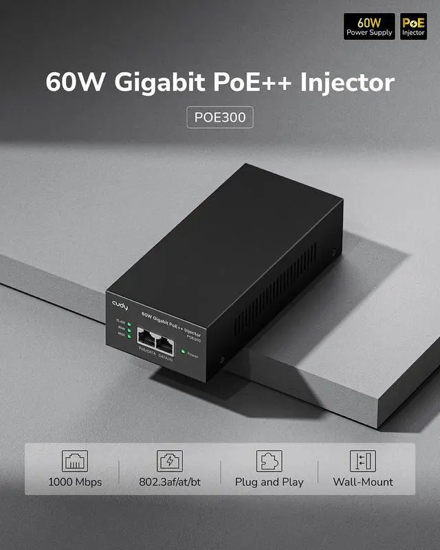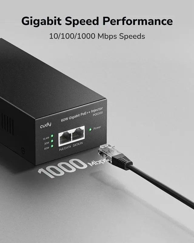 1 Gigabit Ethernet port input and 1 PoE+ Gigabit Ethernet port output offer full duplex 2Gbps Ethernet speeds. ^^ Auto-sensing technology delivers up to 802.3 at 60W to a PoE+ device with backwards compatibility for 802.3 at (30w) and 802.3 af PoE ( 15.4W ) devices. Not support 802.3 bt/PoE++ or any passive PoE devices. ^^ Converts a non-PoE Gigabit port to a PoE+ Gigabit port and Network a PoE device located up to 100 meters (328 ft. ) away. ^^ Plug & play, no configuration is needed, simply connect a PoE network device, accommodates most installations scenarios.