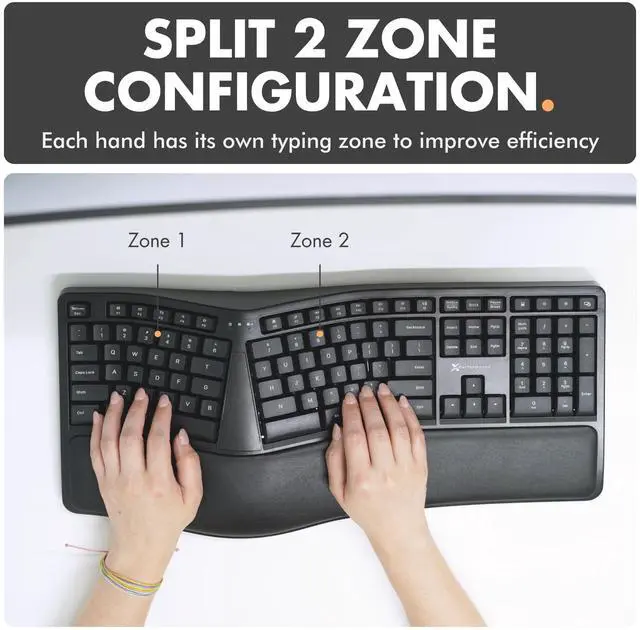 (COMFORTABLE, NATURAL TYPING) Traditional keyboards force you to type awkwardly. Our wireless ergo keyboard for laptop does not, instead it promotes a natural and comfortable typing experience. ^^ (SPLIT KEYBOARD WITH WRIST REST) That is why we integrated a split 2 zone design with 110 keys and a soft wrist cushion to our ergonomic keyboard wireless. As a result, your typing posture is relaxed and comfortable. ^^ (DEPENDABLE 2.4G WIRELESS CONNECTIVITY) Clear the cable clutter on your desk and enjoy a clean workspace. The ergonomic keyboard wireless is plug and play and offers a 30 ft range through the USB-A RF receiver.