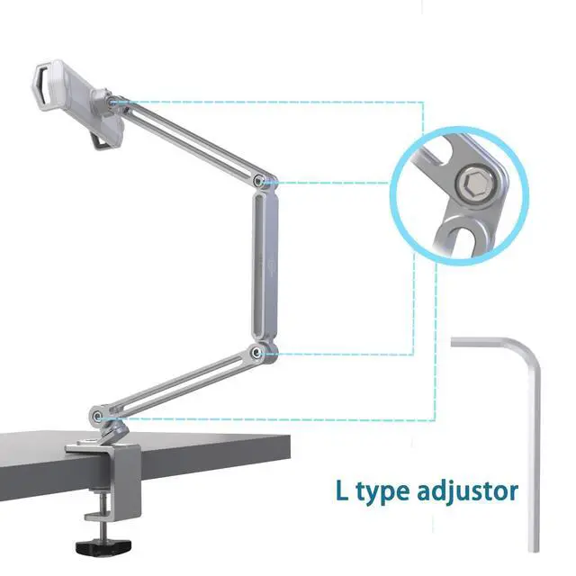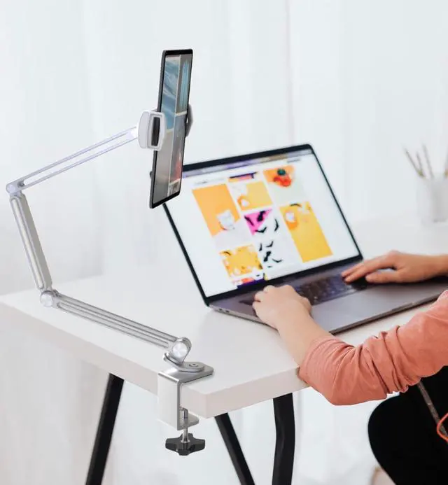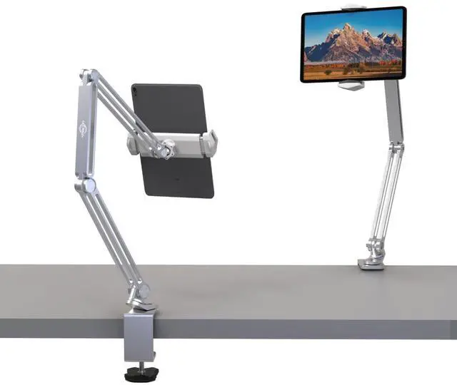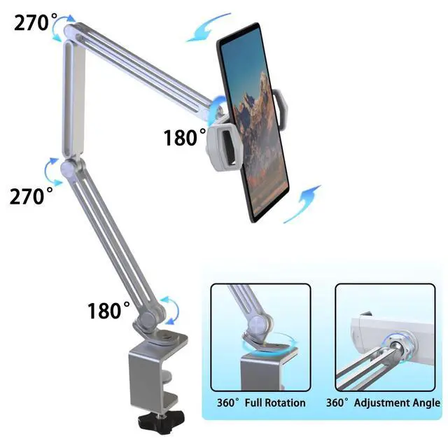 ^^ Extended long arm: 3 sections long arm tablet holder mount(3*270 joints, 1*360 gimbal, 1*universal ball head). Longer distance and more flexible. It is a good helper for you to use your tablet in various scenarios - watching movies, playing games, reading, viewing recipes, etc.