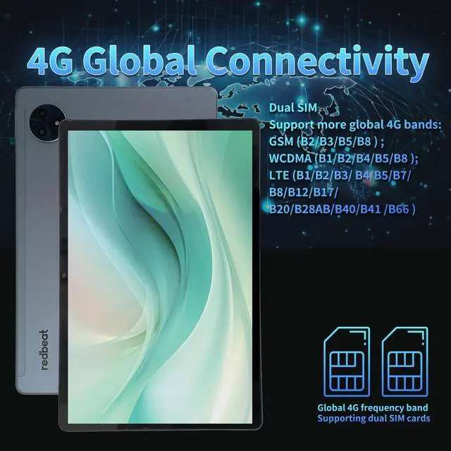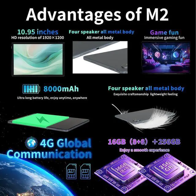 (Network frequency GSM: B2/3/5/8, WCDMA: B1/2/4/5/8, LTE: b1/2/3/4/7/8/12/17/20/28ab /40/41/38/66). ^^ Long-Lasting Battery 8000mAh for 12-hour8000mAh large battery Long-Lasting, 18W fast charge combination, full charge can continuously watch TV for 12 hours/play games for 10 hours, standby for 30 days, innovative independent interface design (Type-C charging port + 3.5 mm headphone jack separate layout), Enjoy Dolby panoramic surround sound created by 4 stereo speakers when charging, completely get rid of the interference of entangled charging cables, and meet the needs of efficient use of the machine in multiple scenarios. ^^ Portability and Stylish DesignRedbeat M2 tablet With a true all-metal body, this tablet is just 0.75 mm thick and weighs just 511g, making the body lighter and thinner for easy carrying, whether for work, study or going out. M2 also has GPS, face unlock and other functions;