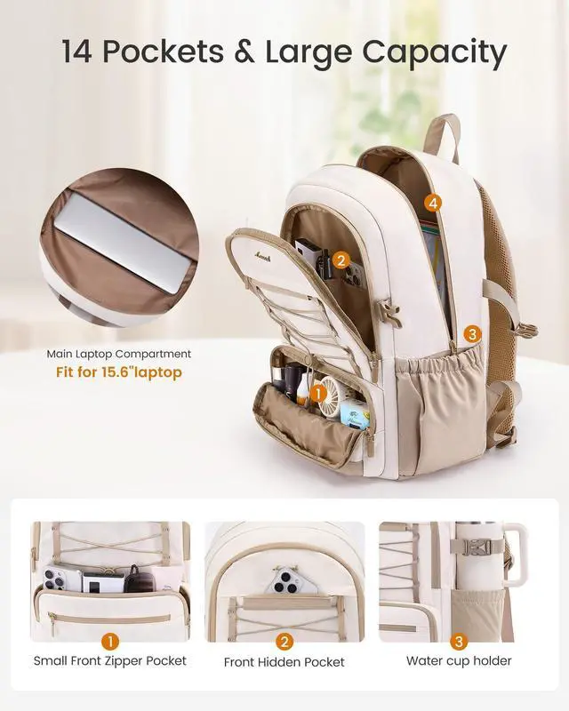 ^^ Spacious & Organized: This large capacity backpack purse for women features a dedicated, padded compartment that perfectly fits and protects 15.6" laptops. With 4 compartments and 14 functional pockets (including a hidden anti-theft pocket), it keeps all your daily essentials, tech gadgets, work items, and personal belongings neatly organized-all in one bag.