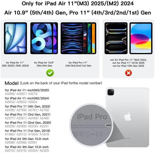 Compatibility: Only compatible with iPad Air 11-inch(M3/2025, M2/2024); iPad Pro 11 inch (2022/2021/2020/2018); iPad Air 5th Generation (2022), and iPad Air 4th Generation (2020).