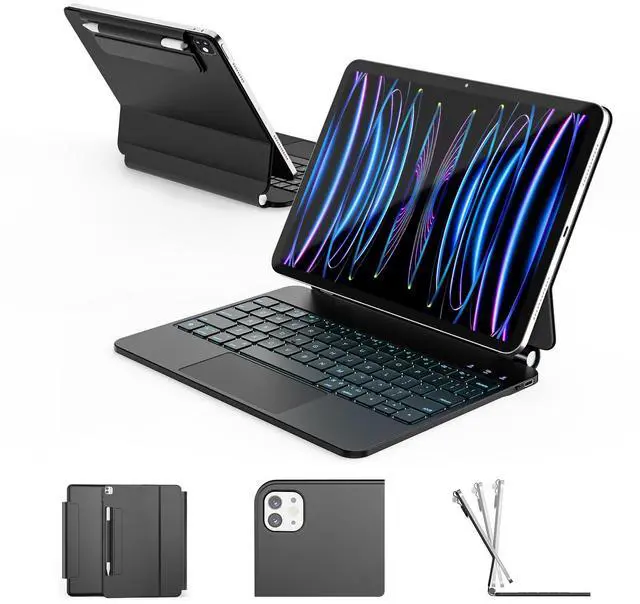 ^^ Quick-Set Magnetic Stand: Ultra-strong magnets seamlessly combine case and tablet to let you easily open the floating cantilever stand to the perfect angle for typing or browsing ^^ Backlight andshortcut key11-color backlight keyboard with shortcuts - fluidly and accurately typing on the lighted keyboard for iPad Pro 11 even in a dark room, ergonomic keys, 11 colors of backlight, and three adjustable backlight brightness levels give you a comfortable typing experience. No more searching around for basic functions, be more efficient with a full row of PadOS shortcuts to adjust brightness levels, change backlit colors, media, volume control, and more.