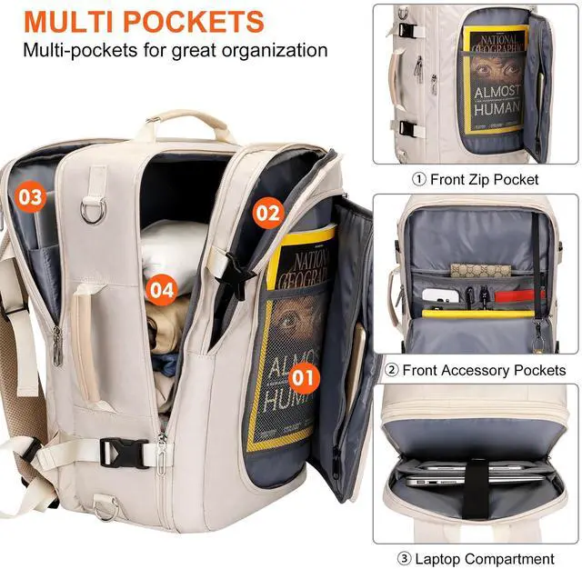 Multi Pockets: This flight essentials travel bag provides 3 spacious compartments for easy organization. 1 front compartment design with multiple small pockets to help keep your items neatly organized. 1 main compartment offers generous space for storing your essentials like clothing. 1 separate laptop compartment that fits 16 inches laptop and 11 inches iPad. 1 side pocket is also included for easy access to a water bottle or umbrella. ^^ Comfort and