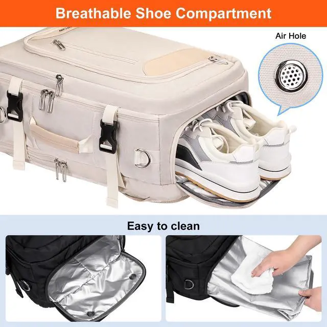 Wet Bag: This travel backpack features a pocket at the bottom designed for shoes, ensuring they are separated from other items. The shoe compartment is equipped with two vents to reduce shoe odor effectively. The backpack also features an integrated wet bag in the main compartment, which is made from premium and water repellent material. It is specifically tailored to separate your dry and wet items, ensuring that they are well organized within your luggage.