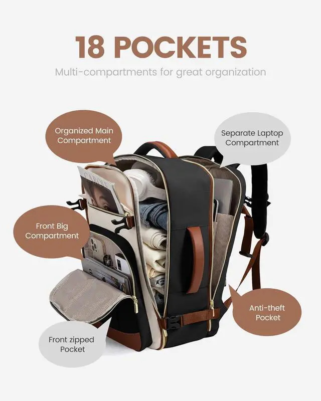 Capacity: Featuring 5 main compartments, this backpack easily accommodates essentials for 3-5 day trips. Organize clothes, shoes, and electronics effortlessly, making it perfect for both business and leisure travel. Side pockets accommodate large water bottles for hydration on the go ^^ Includes Packing Cubes & Wet Pocket: Stay organized and neat with 3 additional packing cubes and a wet pocket for toiletries and damp items. Keep your belongings dry and easily accessible throughout your journey ^^ Durable and